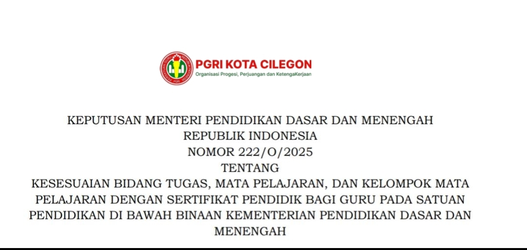Pada tanggal 13 November 2025, Menteri Pendidikan Dasar dan Menengah Republik Indonesia, Bapak Abdul Muti, telah menetapkan Keputusan Menteri Pendidikan Dasar dan Menengah Republik Indonesia Nomor 222/O/2025. Keputusan ini mengatur tentang Kesesuaian Bidang Tugas, Mata Pelajaran, dan Kelompok Mata Pelajaran dengan Sertifikat Pendidik bagi Guru pada Satuan Pendidikan di Bawah Binaan Kementerian Pendidikan Dasar dan Menengah.