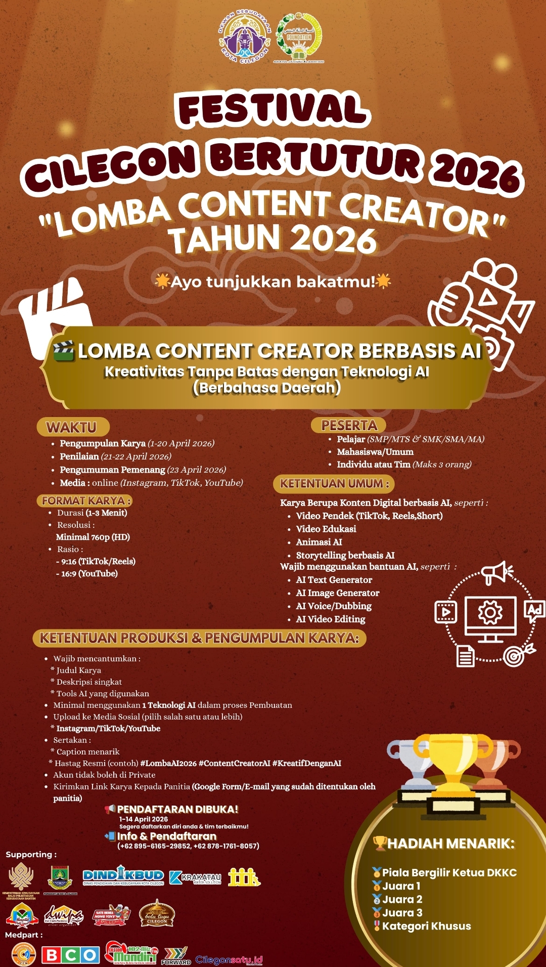 CILEGON – Dunia pendidikan kini berada di persimpangan inovasi digital dan pelestarian nilai tradisional. Menjawab tantangan tersebut, Festival Cilegon Bertutur 2026 resmi membuka pendaftaran Lomba Content Creator Berbasis AI (Berbahasa Daerah). Ajang ini menantang para kreatif muda untuk memadukan kecerdasan buatan (Artificial Intelligence) dengan kekayaan tutur bahasa daerah Cilegon.